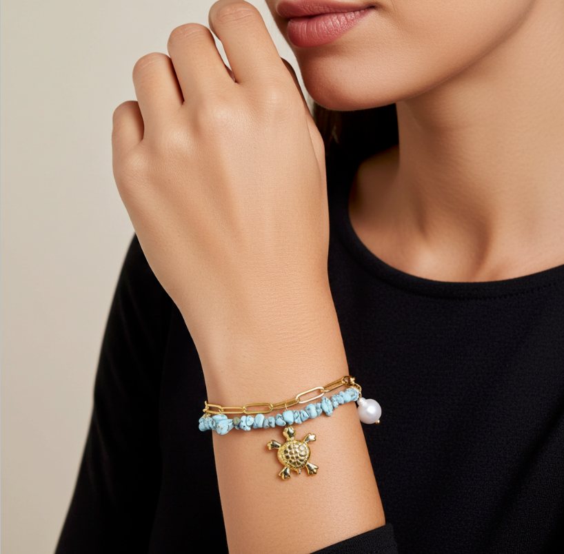 Ein auffälliger goldfarbener Schildkrötenanhänger verleiht dem Veda Armband einen verspielten, maritimen Touch, während eine große Perle am Ende des Designs den Look stilvoll abrundet. Dieses Armband ist ideal für einen fröhlichen, sommerlichen Stil und verleiht jedem Outfit das gewisse Etwas.